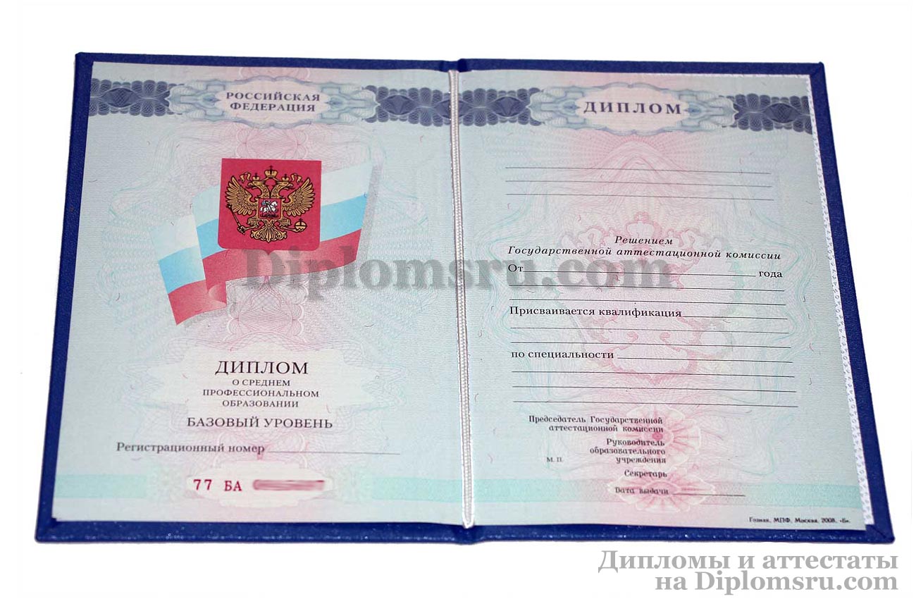 У нас Вы можете купить диплом среднего профессионального образования с окончанием техникума или колледжа в 2007, 2008, 2009, 2010 годах. Заполняется профессионалами, учебная программа и название специальности соответствуют данному периоду, заверяется печатью техникума (колледжа), подписями председателя Госкомиссии и директора ССУЗа. Диплом выглядит так, как в учебном заведении!